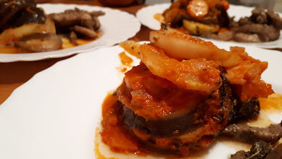 Am acoperit, adica, tava cu hartie de copt pusa cat de cat etans (teoria era sa fie un capac decupat fix dupa forma tavii, daaa, sigur, cum sa nu....). Am pus tava in cuptorul incins in prealabil, la foc mediu, 35 de minute cu capacul de hartie si inca vreo 20 fara, sa se bronzeze nitel chestiunea.